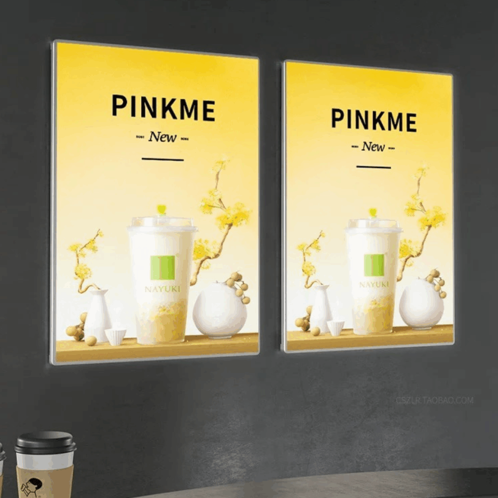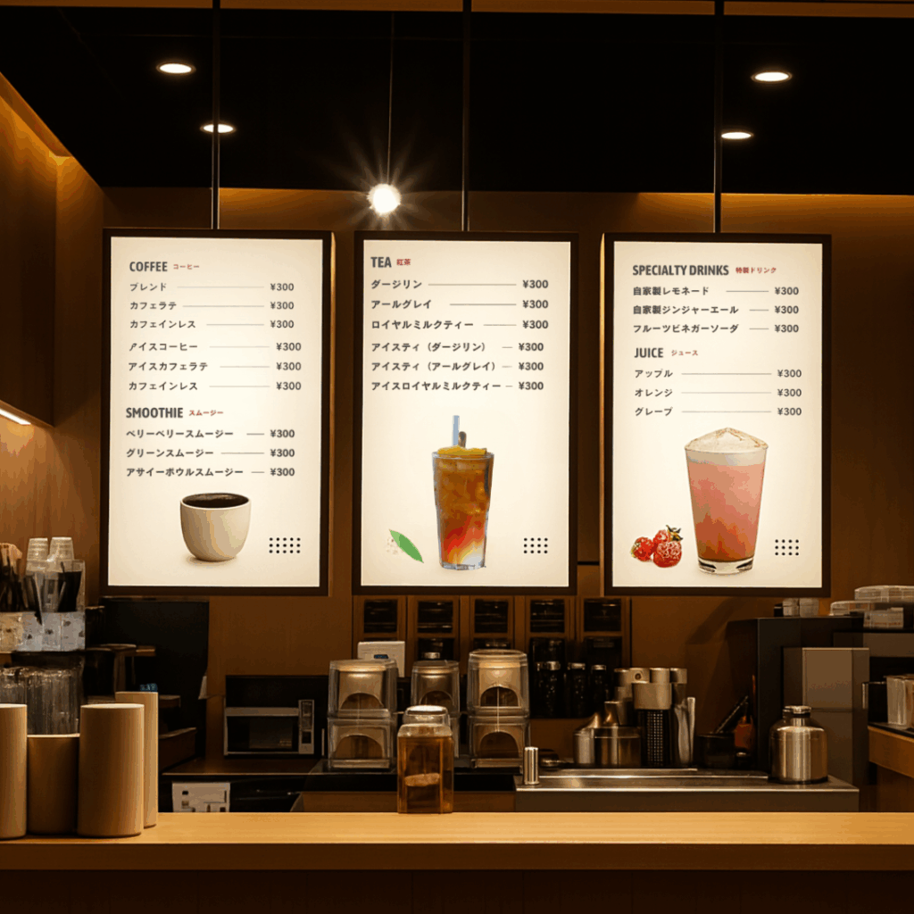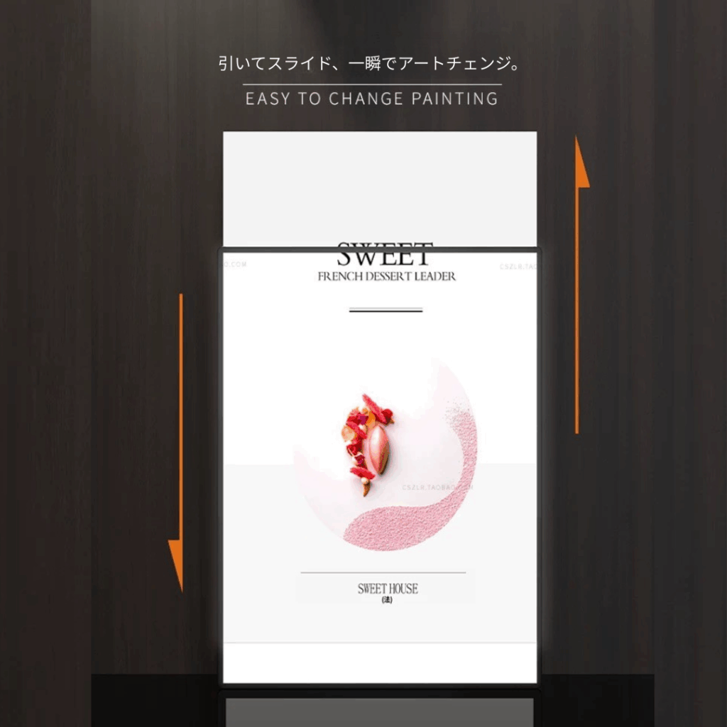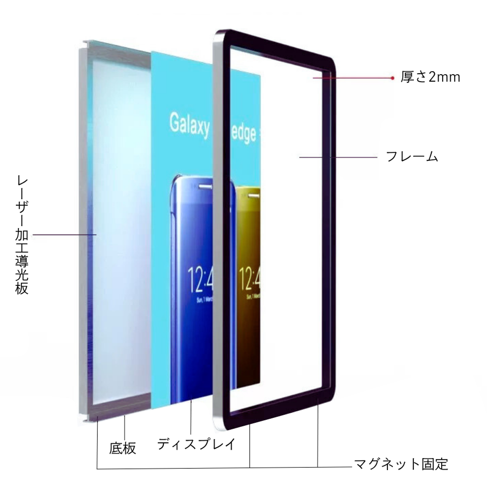フレーム内のバックライトが光ることでディスプレイ(印刷物・バックライトフィルム)が明るく見える掲示板です。 印刷物をフレーム内でスライドして交換することが可能。印刷物が明るく、非常に読みやすくなるのが特徴。 飲食店でのメニューやおすすめ商品のPOPとして幅広く活用いただけます。 フレームのみ、印刷物のみでの取り扱いも承っております。